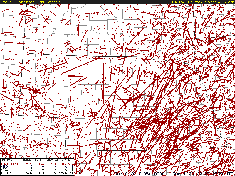 The following maps were generated by an on-line program, "Severe Plot", located at the Storm Prediction Center. The data in this archive runs from 1950 thru 2023 and has not been updated beyond 2023 at this time (January 2025). The data archive is updated annually, by mid-year, after all the recent data are thoroughly verified. Preliminary vs final tornado counts. The Year 2024 data will be available for mapping later this year (Summer or Fall 2025).
