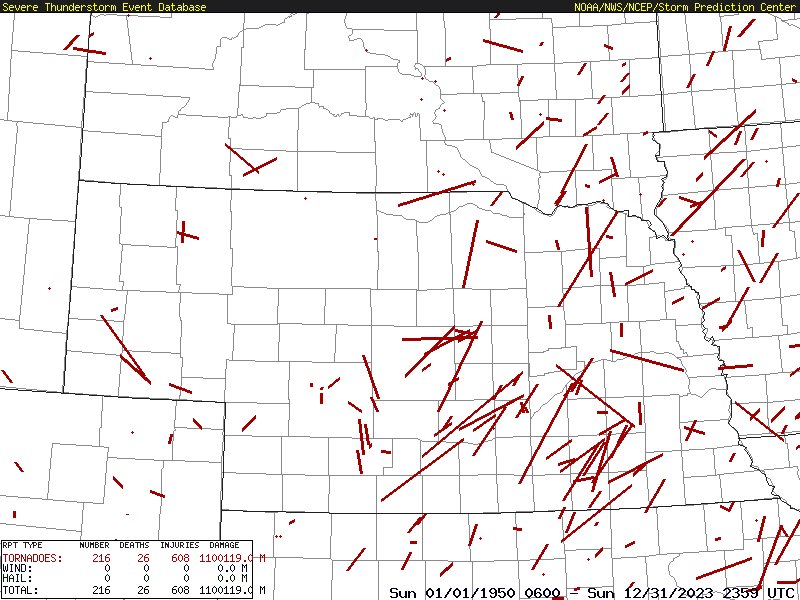 There are seven maps: (E)F0; (E)F1; (E)F2; (E)F3; (E)F4; (E)F5 tornadoes AND, All Tornadoes (E)F0-(E)F5 for the period 1950 thru 2023 and centered on Nebraska.